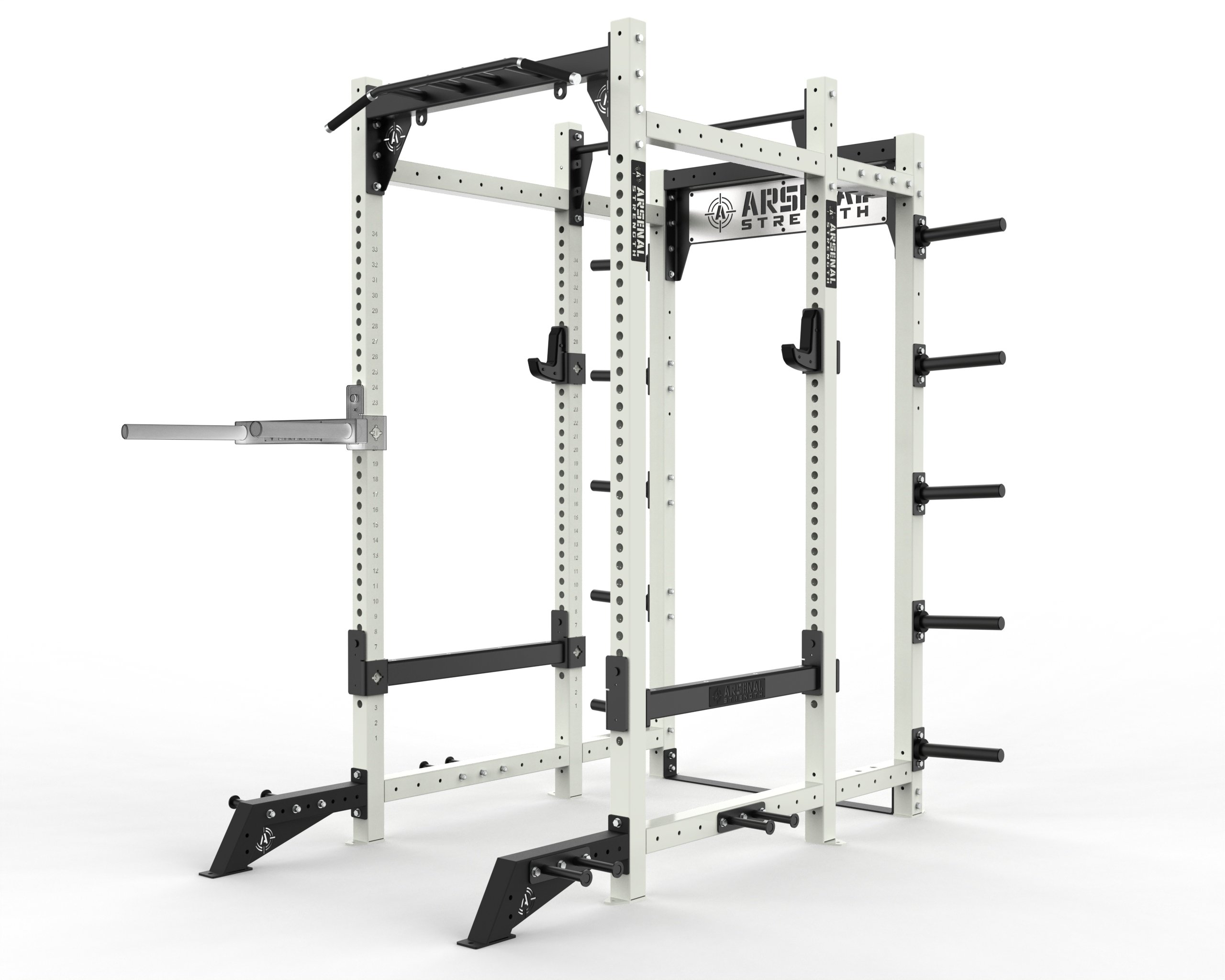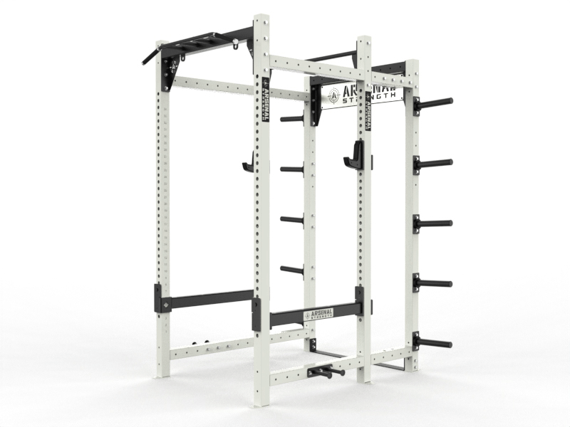 The Arsenal Strength Alpha Series 11 Gauge Racks are comprised of 3×3 11 gauge uprights, 2 inch incremental height adjustments, a customizable, standard bar storage, band pegs, and multi grip pull up crossbars are highlights of this series. Available in Half Rack, Power Rack, and Double Half Rack options.