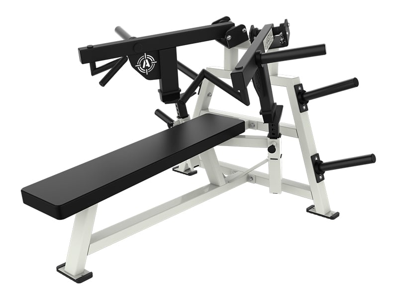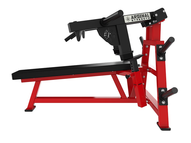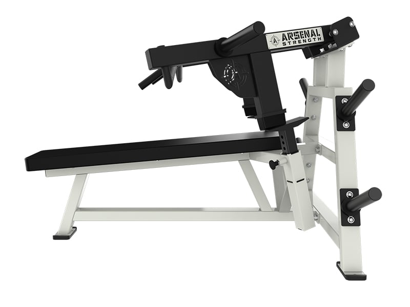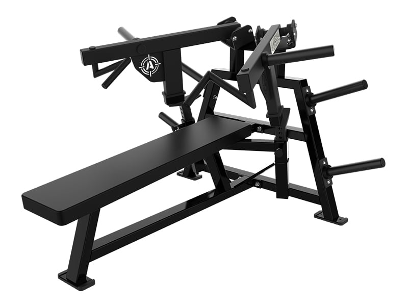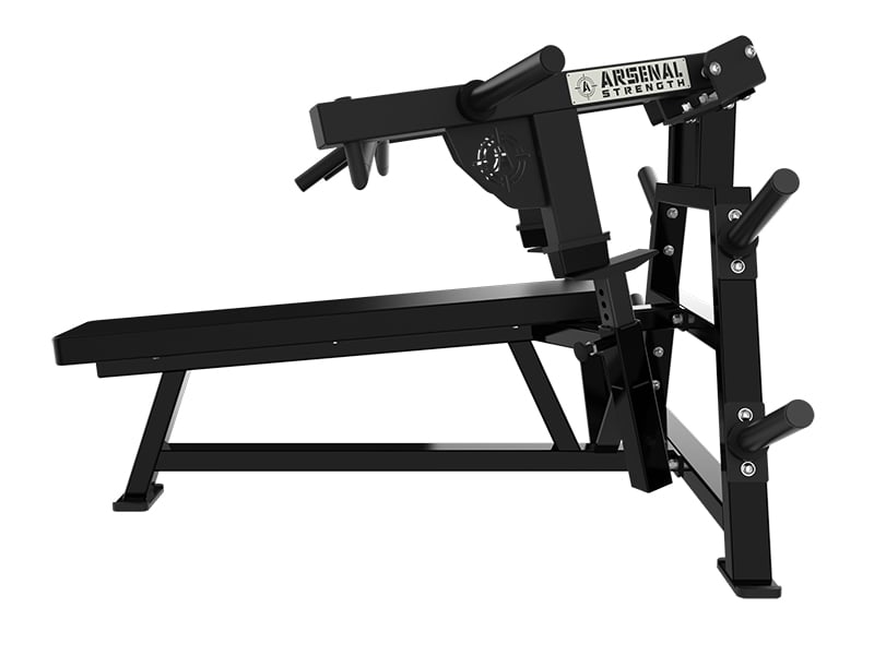 The Arsenal Strength Reloaded ISO Flat Press is a supine chest press with multiple knurled grip options. Gas assisted range limiters and a long pad allow proper alignment while performing the exercise.