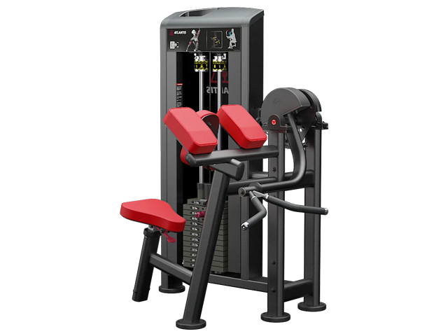 The ATLANTIS Bicep Curl machine is designed for optimal performance and comfort, featuring an adjustable sternum pad that ensures proper axis of rotation alignment. Its counterbalanced lever arm provides lower starting resistance for smoother motion.