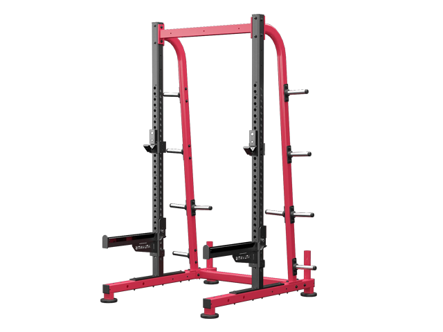 The adjustable feet allow you to level the unit on any floor, while the included attachments, such as premium weight storage horns and safety bars, make this half rack a complete and convenient workout solution.