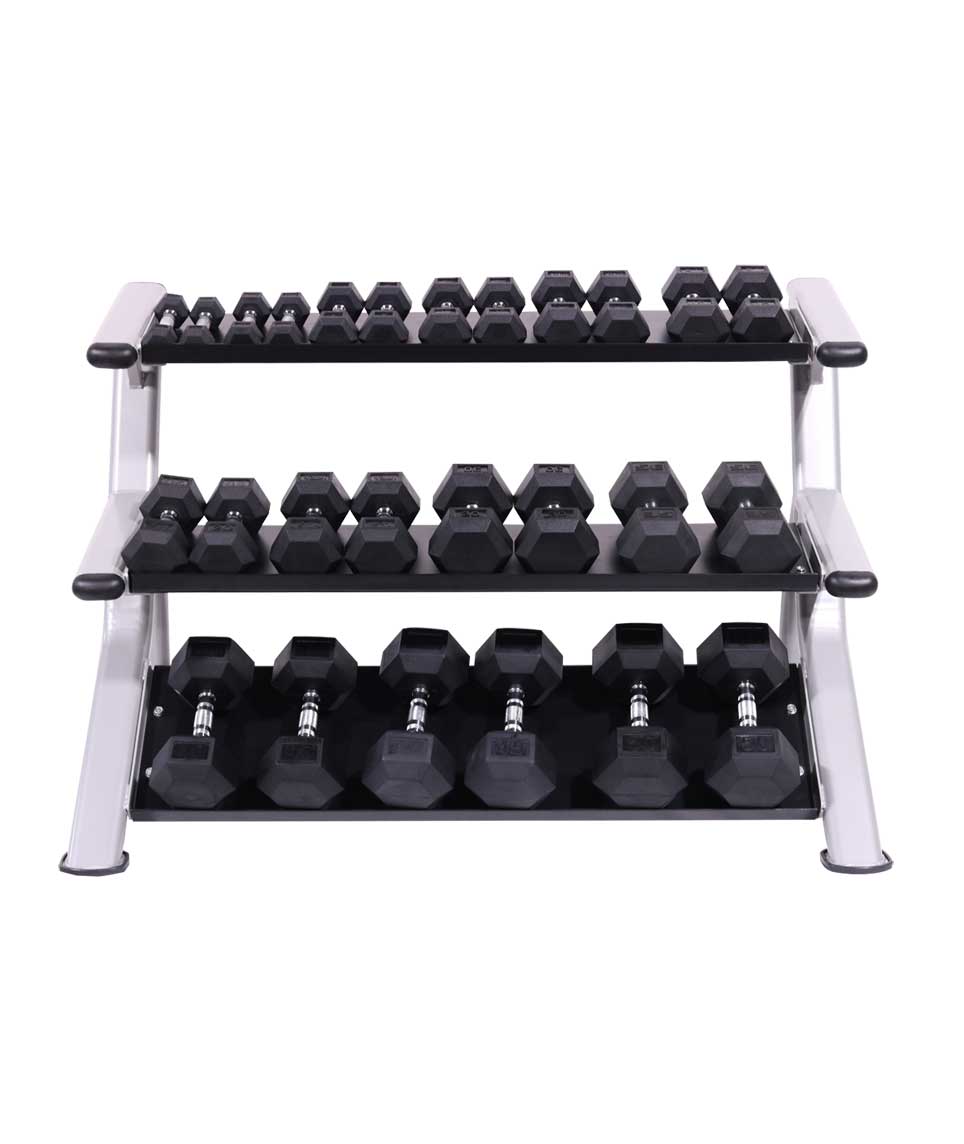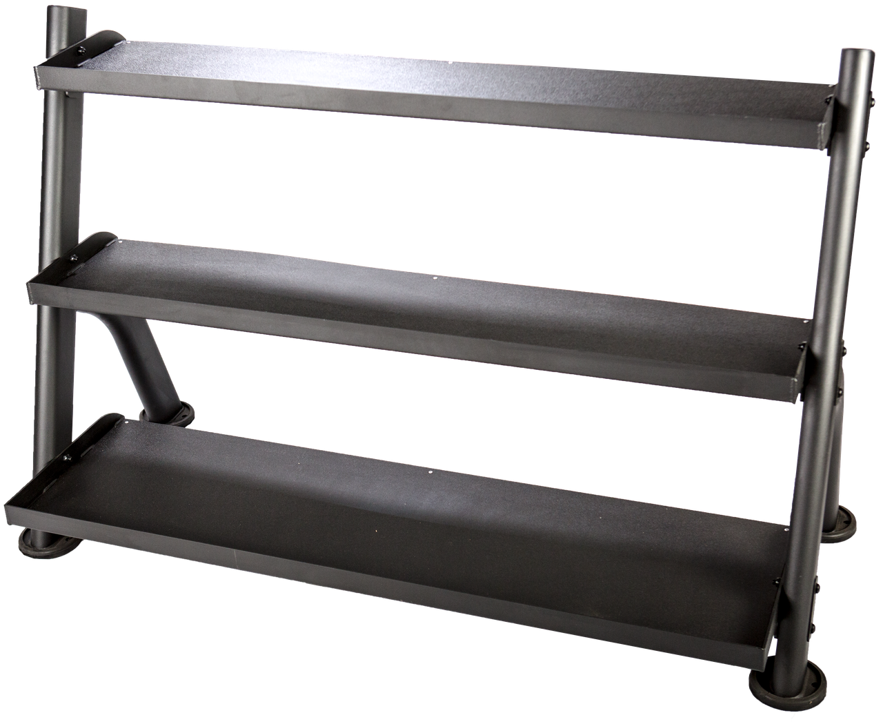 Its three-tier tray design accommodates up to 13 pairs of dumbbells, ensuring easy access and a tidy workout area. Constructed from heavy-duty steel and finished with a durable powder coat, this rack is built to withstand the demands of both commercial and home gyms.